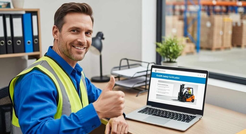 Online Forklift Certification boosts safety by teaching proper operating techniques and hazard awareness, ensures compliance by meeting OSHA standards, improves efficiency by allowing training anytime without disrupting work, and saves time and money by reducing downtime, travel, and instructor costs.